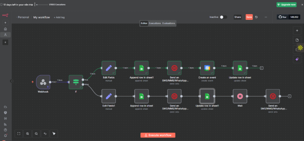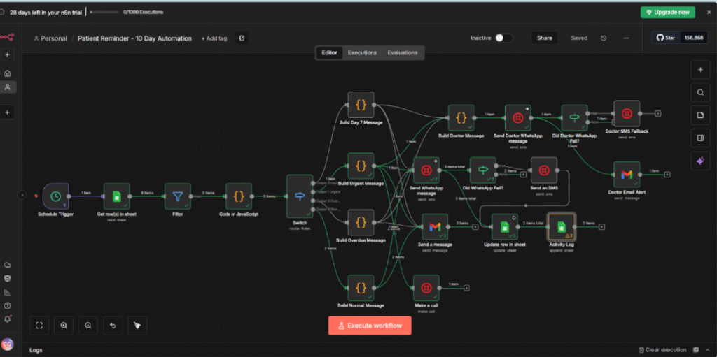 This workflow automatically monitors patient requests from your Google Sheet and calculates reminder timings. Every minute, it: