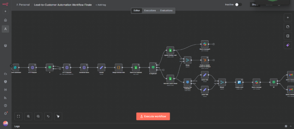 I built a Lead-to-Customer automation in n8n that captures, validates, enriches, and routes leads automatically. It prevents duplicates, assigns leads based on company size, triggers follow-ups, and logs errors with retry logic for reliability. After multiple rebuilds, the final system eliminated silent failures and ensured no lead was missed, delayed, or mishandled.