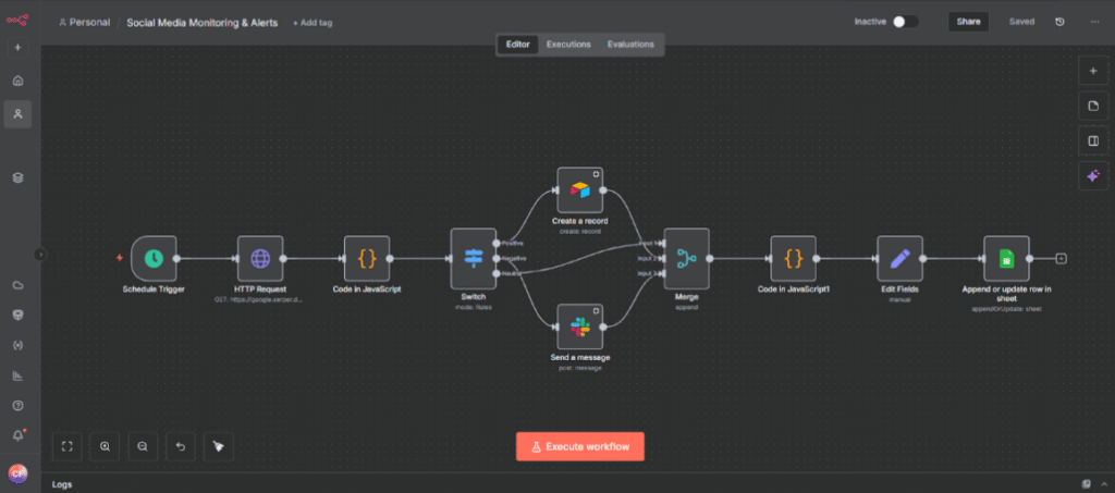 I built an automated brand intelligence workflow with n8n that monitors real-time brand mentions from Google News, analyzes sentiment using custom JavaScript logic, and routes insights automatically. Negative mentions trigger instant Slack alerts, positive mentions are saved to Airtable, and all data is logged in Google Sheets for long-term analysis—turning brand monitoring into a scalable, cost-effective system.